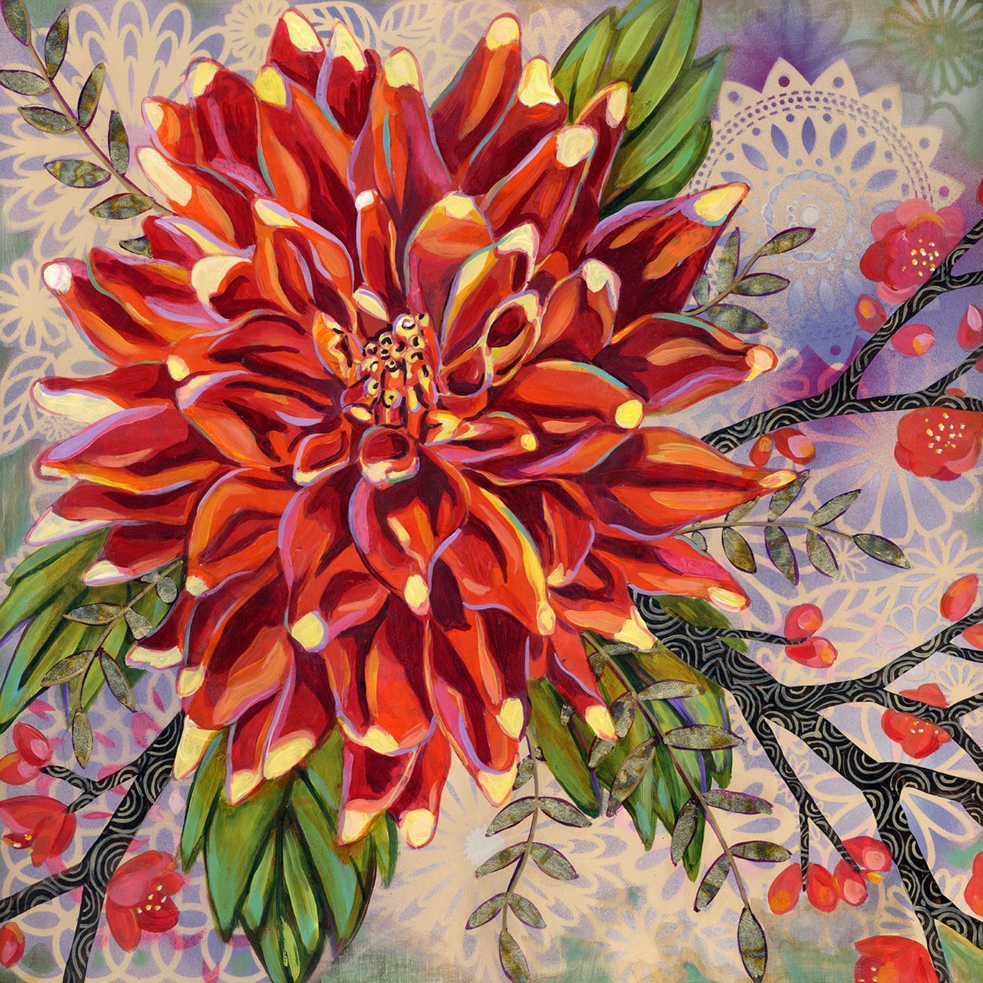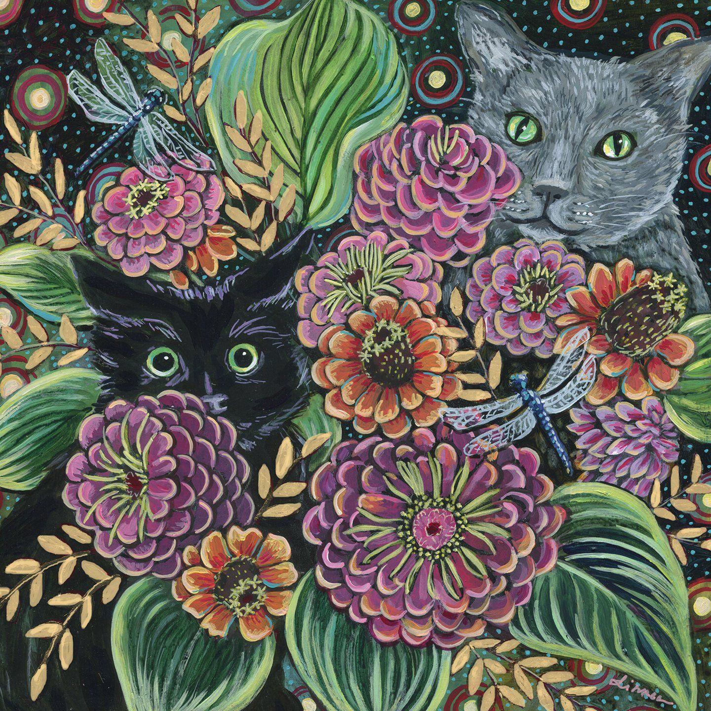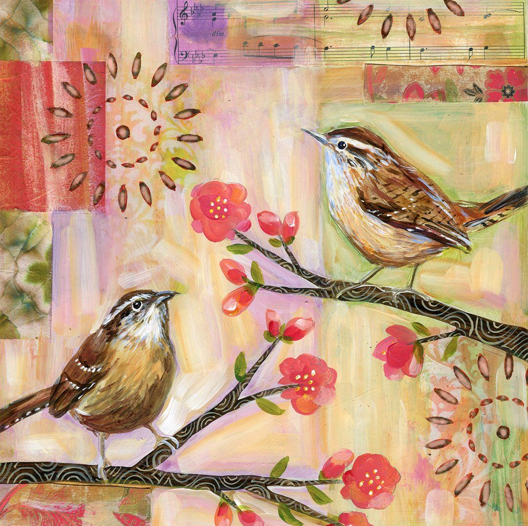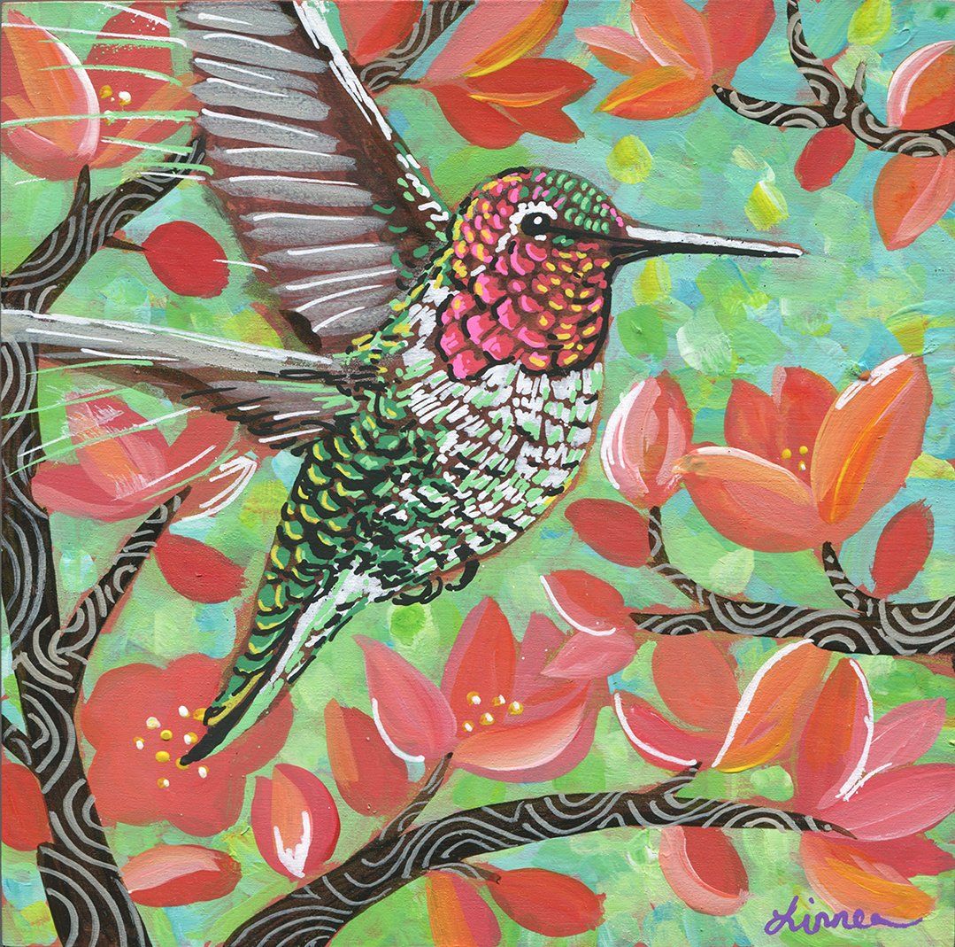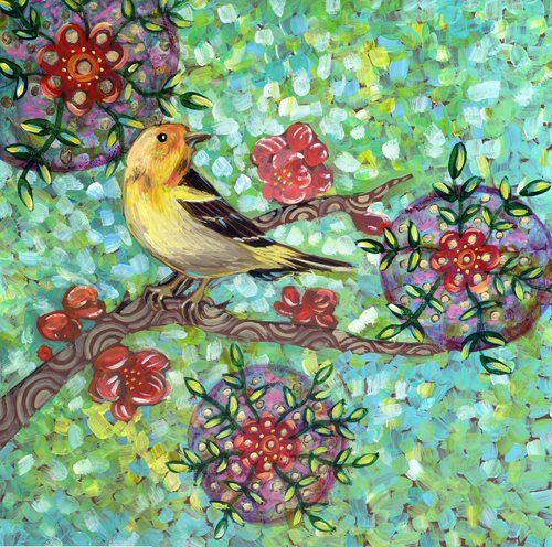 "I enjoy painting modern interpretations of nature. I’m inspired by my daily walks and the changes I observe from day to day. The birds, trees, plants, light and color that I see emerge later in the paintings I create. I am influenced by textile design, the connection between the physical and spiritual worlds, optical illusions, and the changing of the seasons. I use watercolor and acrylic paint, combining collage and texture with abstract forms and patterns. I also create monotypes when I have access to a printing press. Each painting or print has multiple layers of color to heighten contrasts and create an inner glow. I am inspired by the forms and patterns in my garden, my family and my pets - bits and pieces of my everyday life combining themselves into new forms."